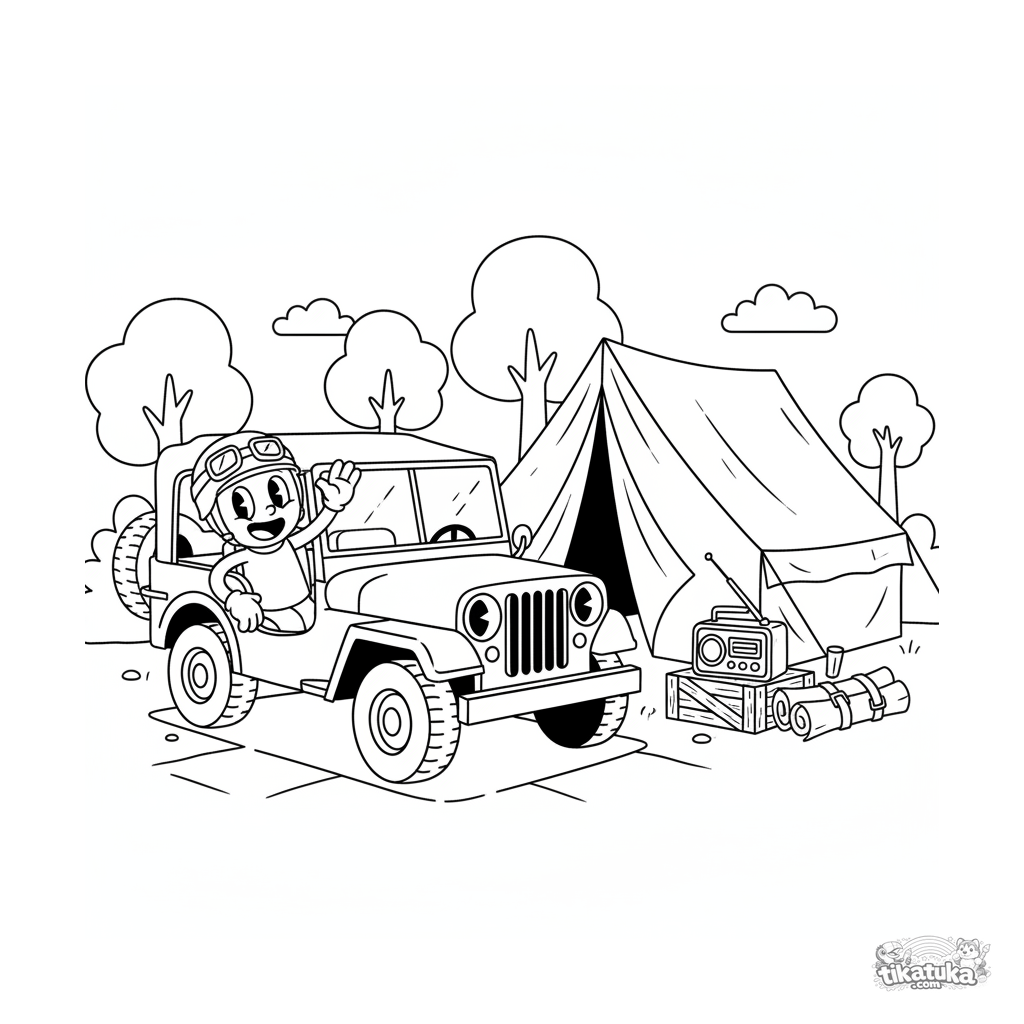 Página para colorir para crianças de 4-6 anos: um Jeep Willys vintage estacionado perto de uma barraca de quartel-general de campo. Um motorista alegre acena, cercado por mapas e um rádio de campo.