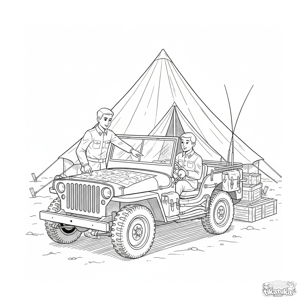 Página para colorir detalhada estilo vintage para 10-12 anos: um comandante realiza uma reunião usando o capô de um jipe como mesa, perto de um QG de campo. Trabalho de linha gravada limpa.