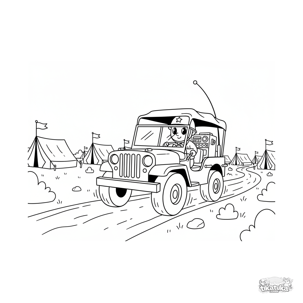 Página para colorir para 7-9 anos: um jipe retro com rádio dirige lentamente entre as barracas do quartel-general. Estilo de desenho animado antigo.
