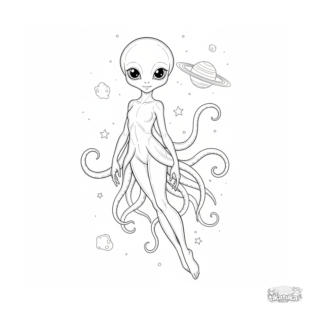 Página para colorir para crianças de 7-9 anos: uma criatura graciosa tipo água-viva flutua entre estrelas na frente de um planeta com anéis.
