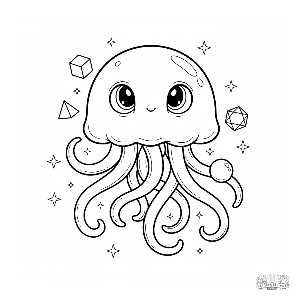 Página para colorir para crianças 7-9: um alienígena gracioso tipo água-viva flutua entre estrelas, acompanhado por cristais geométricos em uma cena espacial mágica.