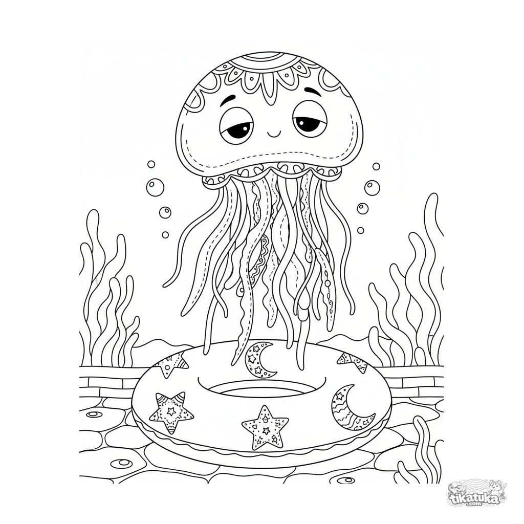 Página para colorir detalhada para crianças mais velhas de 10-12 anos: uma água-viva graciosa flutua sobre um anel inflável estampado no fundo da piscina.