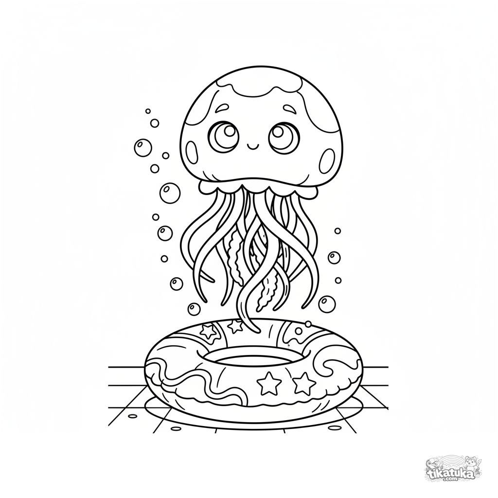 Página para colorir para pré-adolescentes 7-9: uma suave água-viva translúcida com tentáculos longos flutua sobre um anel inflável no fundo da piscina.