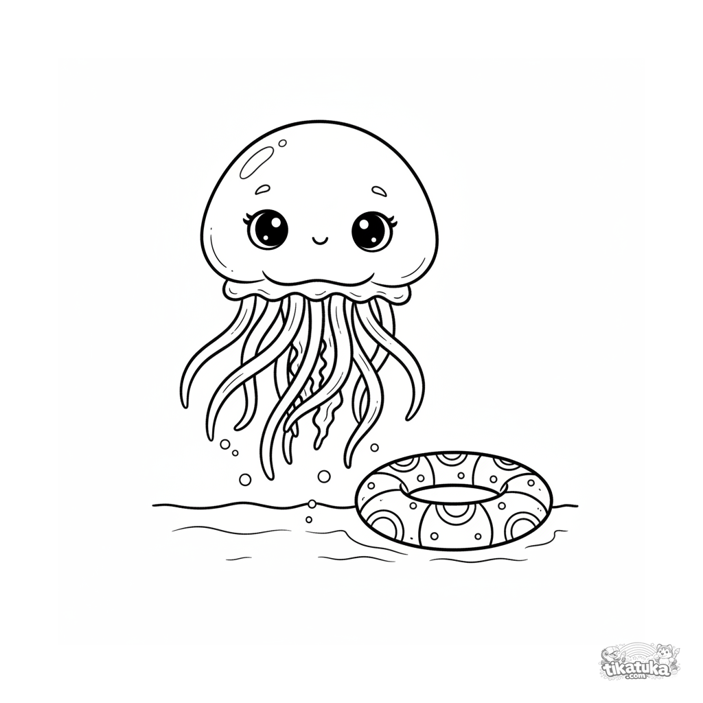 Página para colorir para crianças 7-9: uma água-viva suave flutua perto de um anel inflável no fundo da piscina. Linhas fluidas, cena pacífica.