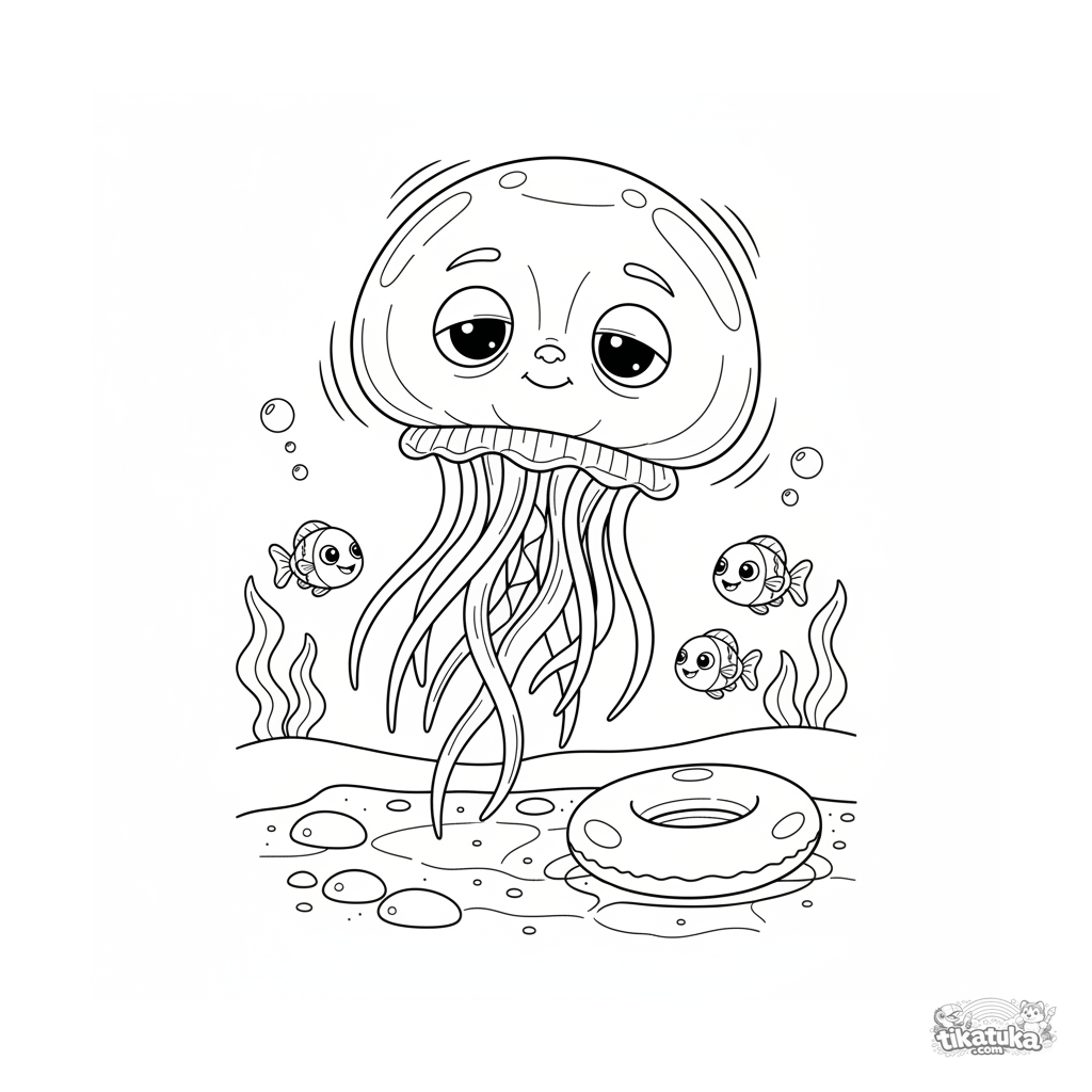Página para colorir para crianças de 7-9 anos: uma água-viva suave com peixinhos flutua lentamente passando por um anel inflável no fundo da piscina.