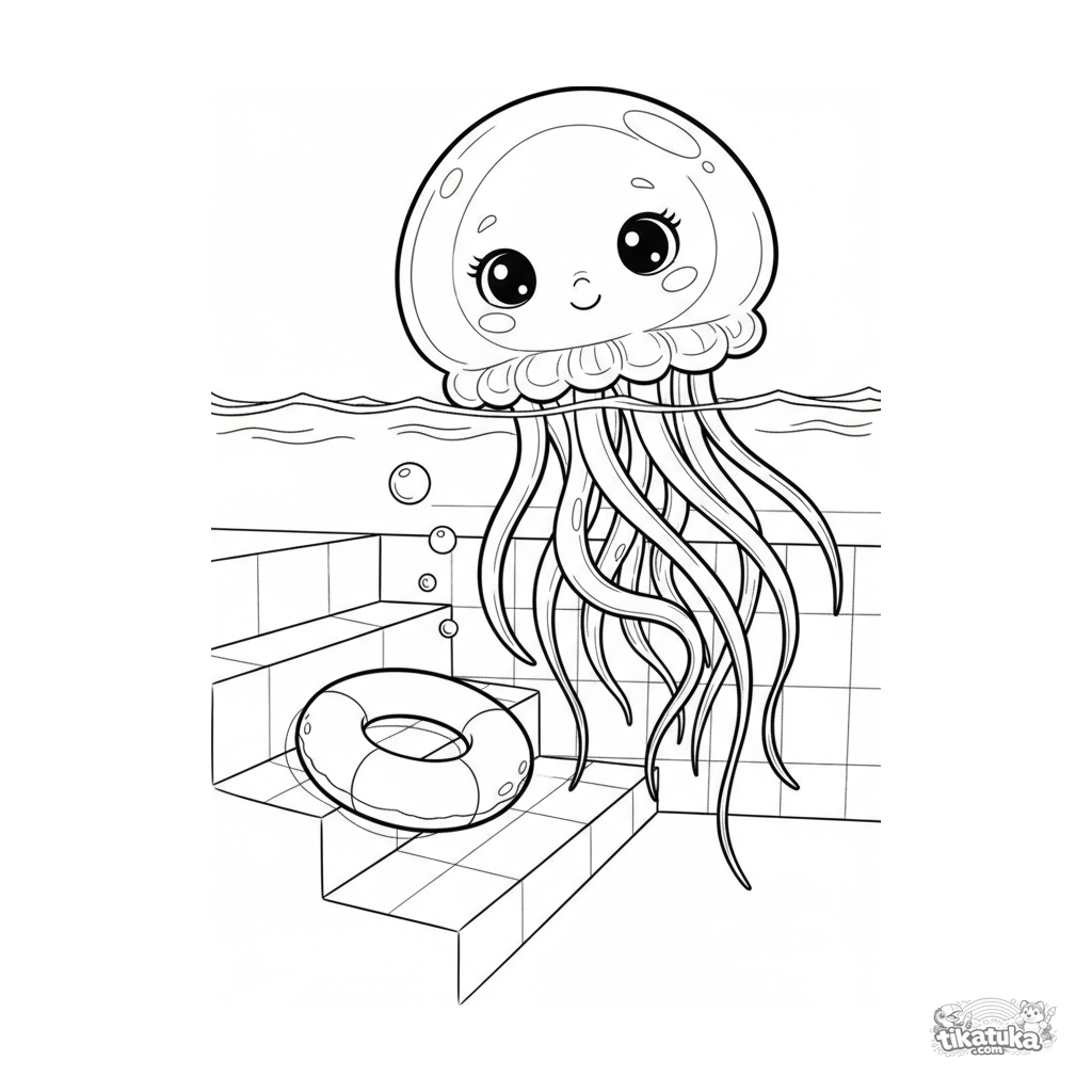 Página para colorir para crianças de 7-9 anos: uma água-viva suave com tentáculos longos flutua lentamente pelos degraus da piscina, com um anel inflável por perto. Linhas fluidas.