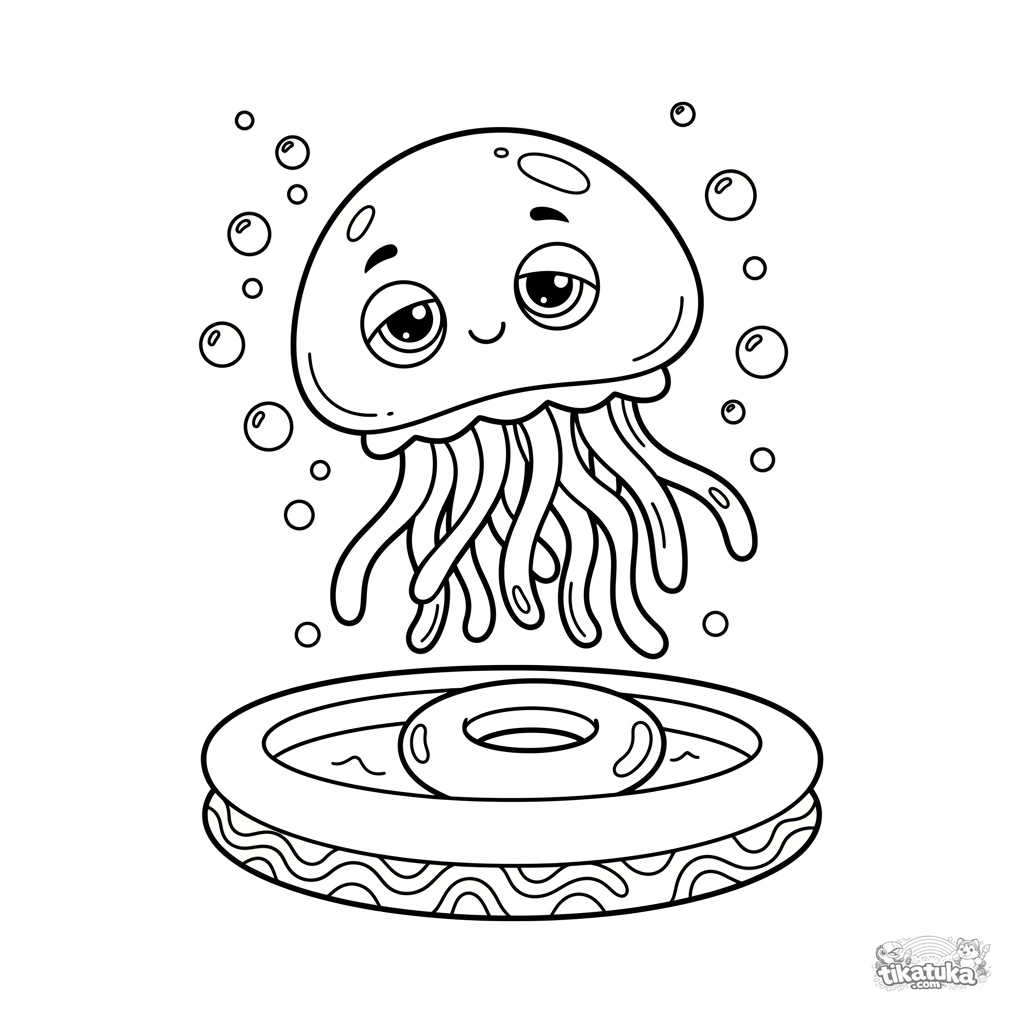 Página para colorir muito simples para bebês de 2-3 anos: uma água-viva redonda com tentáculos flutua sobre o fundo de uma piscina, com bolhas ao redor. Formas grandes fechadas, detalhes mínimos.