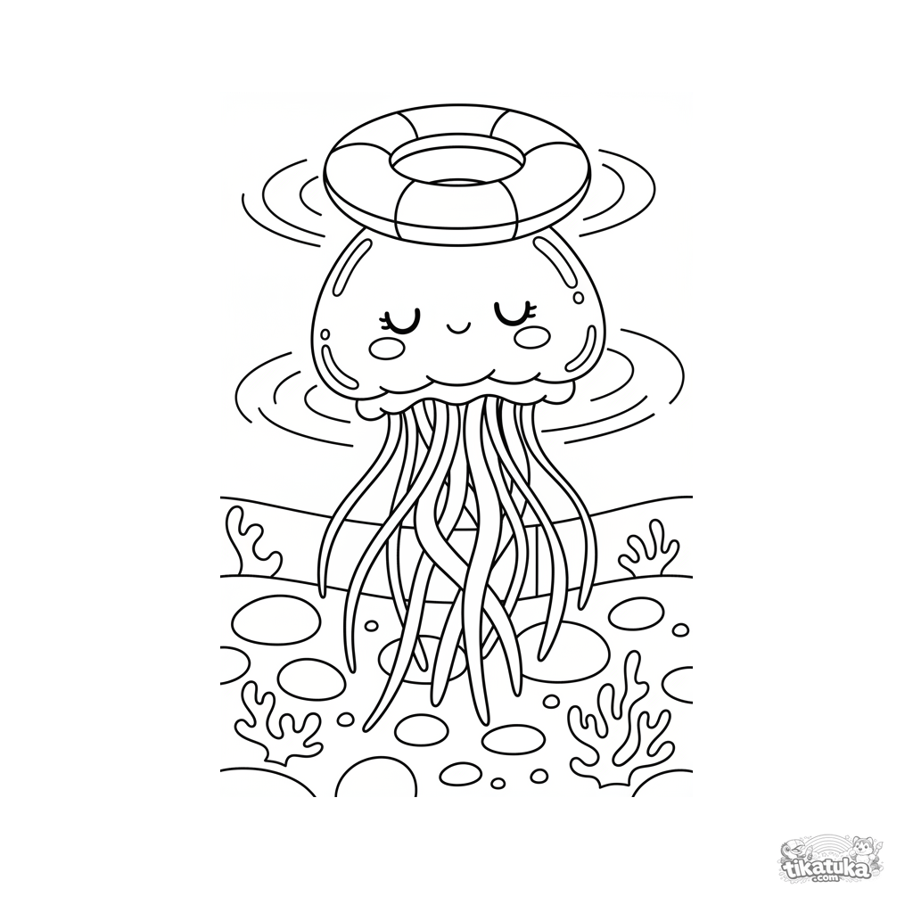 Página para colorir para crianças de 7-9 anos: uma suave água-viva com tentáculos longos flutua na parte funda da piscina sob uma boia. Linhas fluidas, clima pacífico.