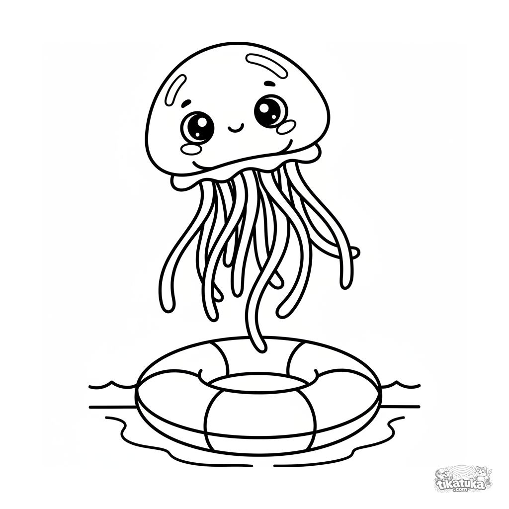 Página simples para colorir para bebês 2-3: uma água-viva grande flutua sobre um anel inflável no fundo da piscina.