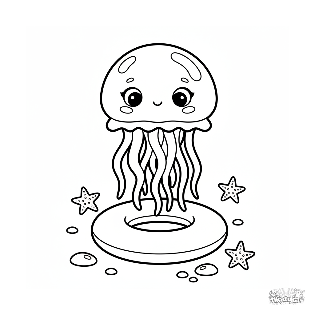 Página para colorir simples para bebês 2-3 anos: uma água-viva gentil com tentáculos longos flutua sobre uma boia murcha no fundo da piscina. Formas grandes e simples.
