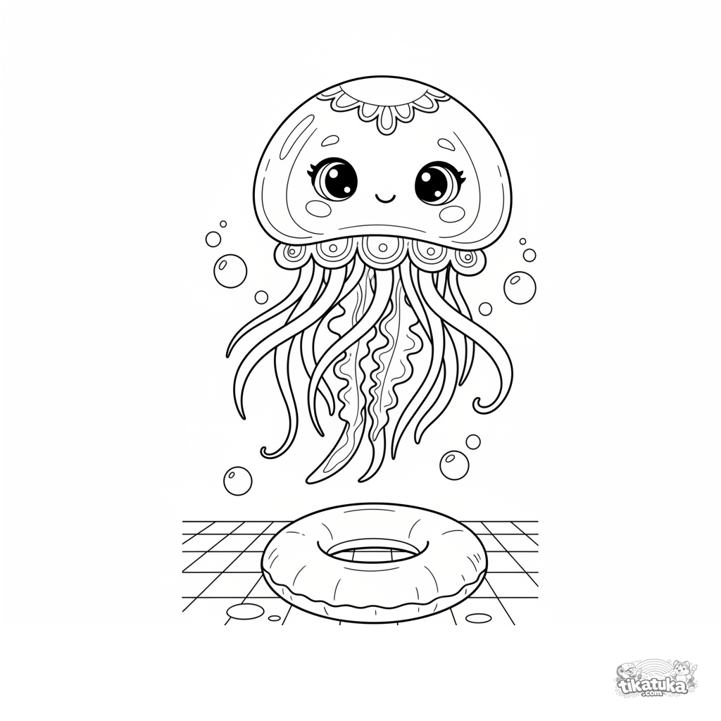 Página para colorir detalhada para crianças mais velhas de 10-12 anos: uma água-viva graciosa flutua sobre o fundo da piscina passando por um anel vazio. Tentáculos detalhados, estilo de esboço em aquarela, atmosfera serena.