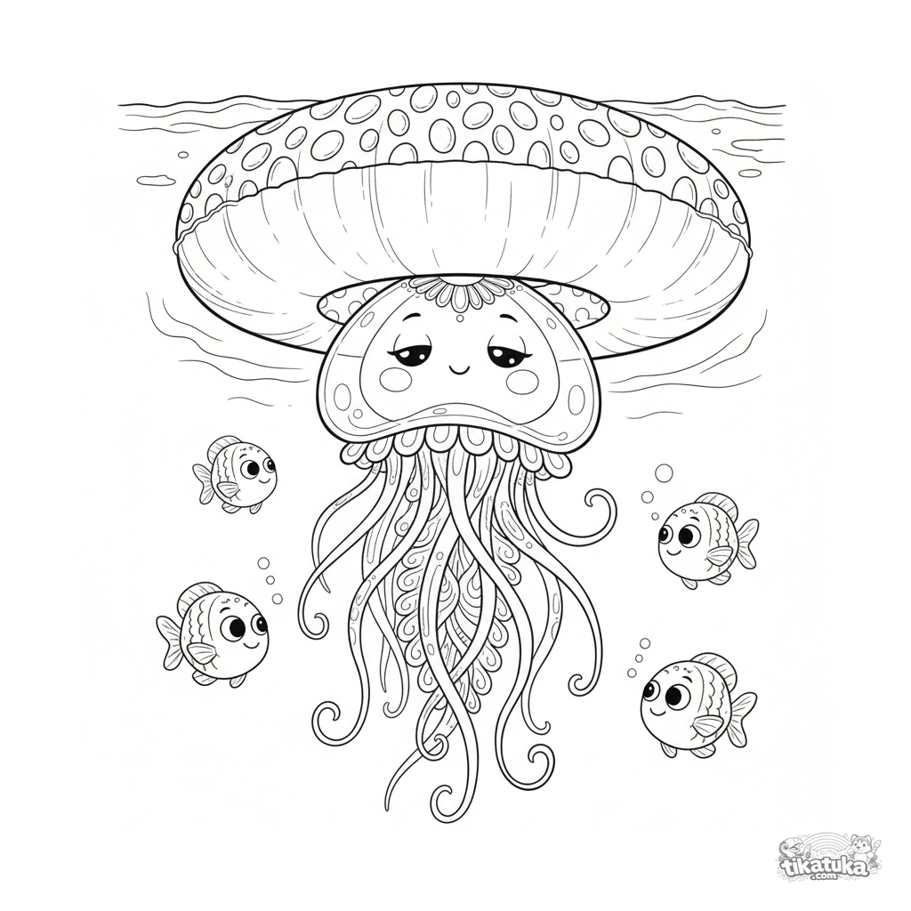 Página para colorir detalhada para crianças mais velhas 10-12: uma água-viva graciosa com tentáculos longos inspeciona a parte inferior de uma boia no fundo da piscina. Texturas, transparência e expressão curiosa.