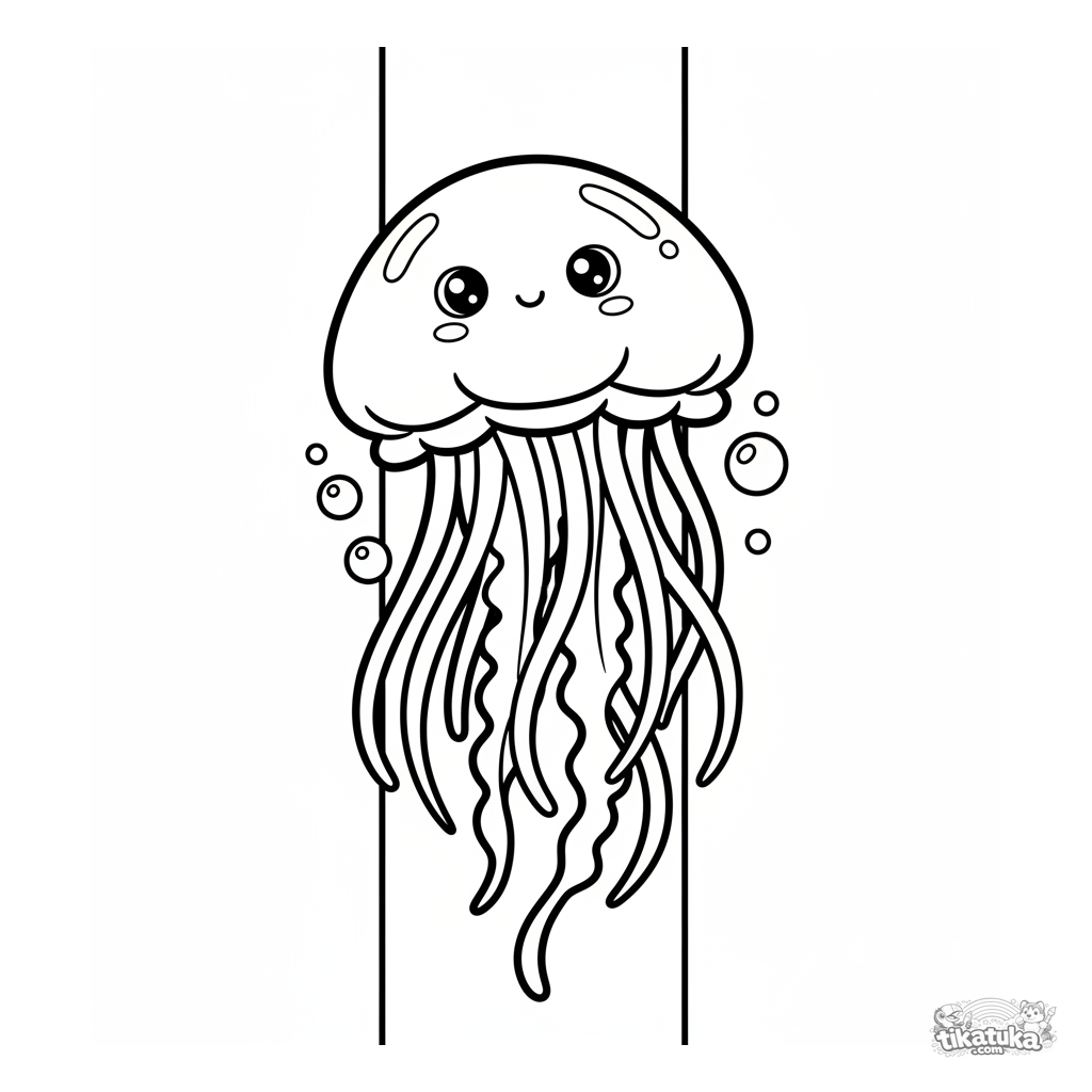 Página para colorir muito simples para crianças pequenas 2-3: uma água-viva fofa flutua em um raio de sol em águas rasas. Formas grandes e claras.