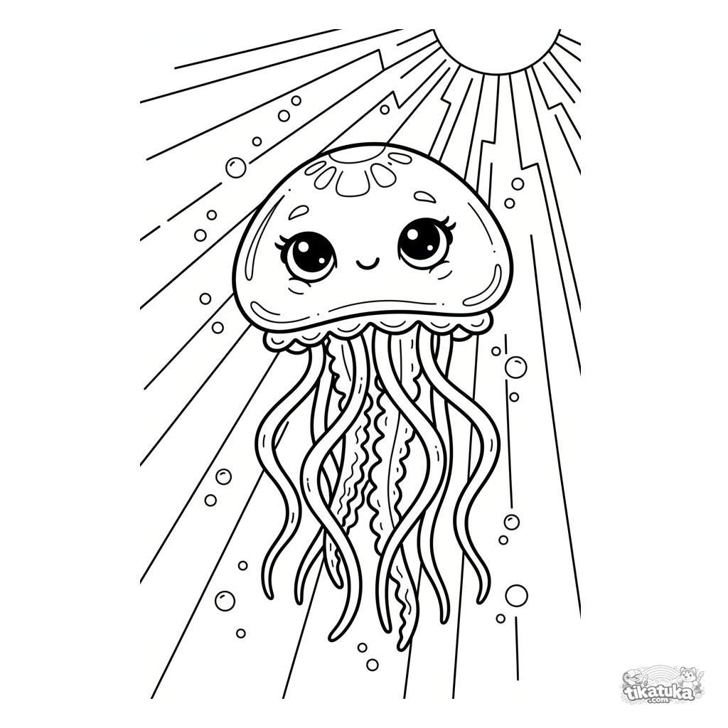 Página para colorir para crianças 4-6: uma água-viva graciosa pulsa suavemente para cima através de um raio de sol em águas rasas.