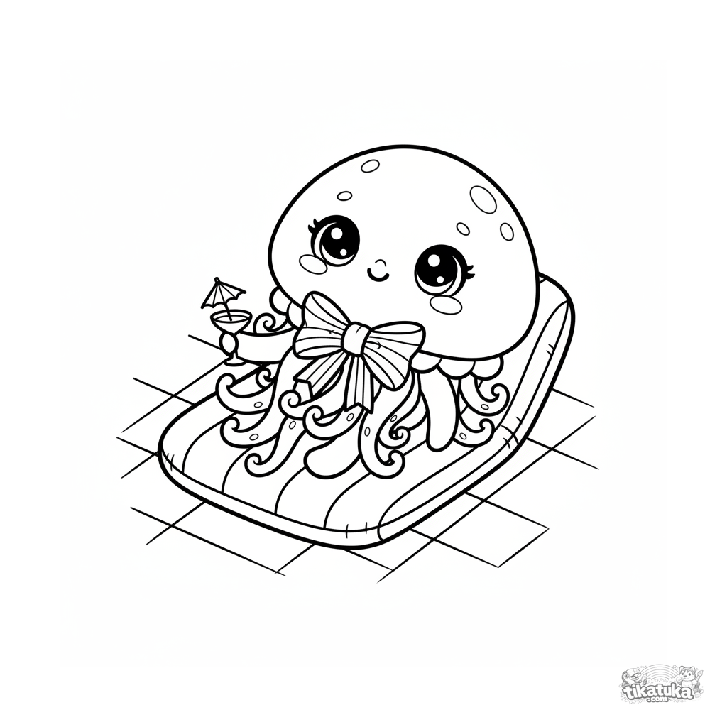 Página para colorir para crianças de 4-6 anos: uma água-viva fofa com um laço relaxa em uma cadeira inflável no fundo de uma piscina. Cena divertida, detalhes simples.