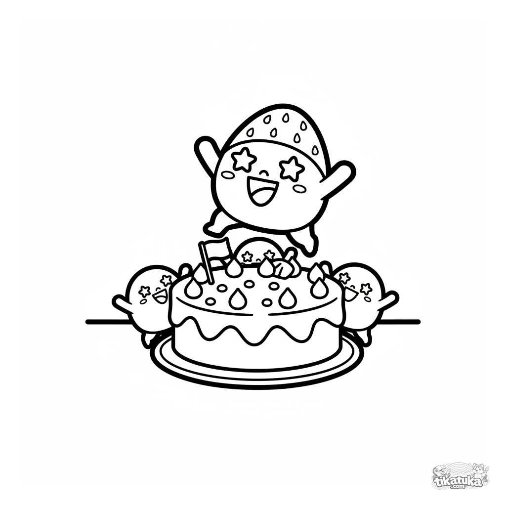 Página muito simples para colorir para crianças de 2-3 anos: um mochi feliz pulando em um bolo. Formas grandes, detalhes mínimos.