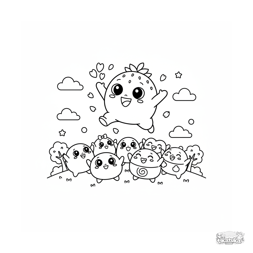 Página para colorir para crianças de 4-6 anos. Um mochi de morango alegre joga confete de pétalas. Cena festiva estilo Disney clássico.