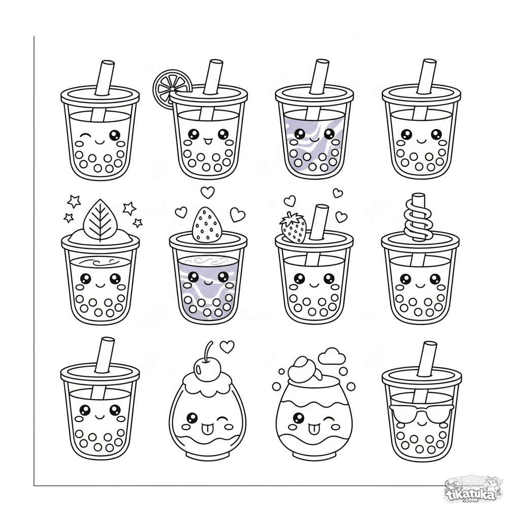 Página de coleção para colorir para crianças de 7-12 anos: uma folha com 12 personagens de bebidas boba kawaii. Múltiplos objetos separados para colorir e recortar.