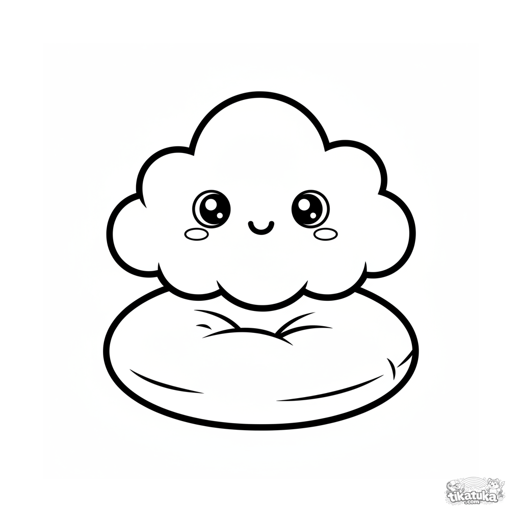 Página para colorir kawaii para bebês: uma nuvem fofa e sorridente flutua sobre um travesseiro macio. Formas muito simples e fofas.