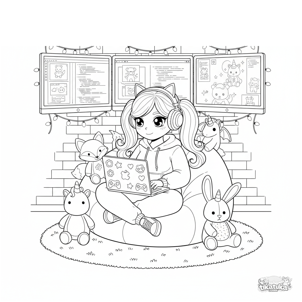 Página para colorir para crianças de 10-12 anos: uma programadora fofa no estilo kawaii trabalha em um cantinho aconchegante do porão. Muitos detalhes.