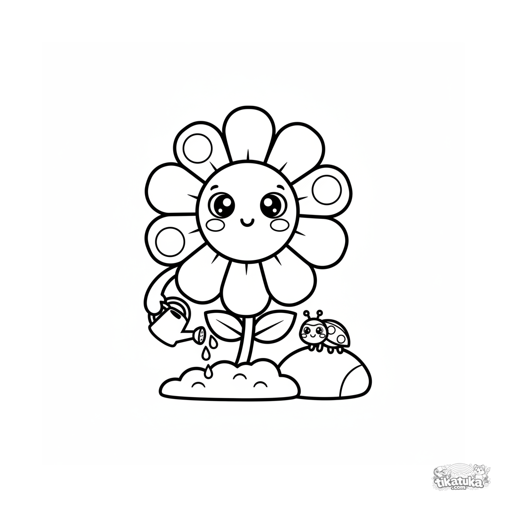 Página para colorir para bebês 2-3: uma margarida fofa com rosto se regando com um regador. Formas grandes e simples, perfeita para começar.