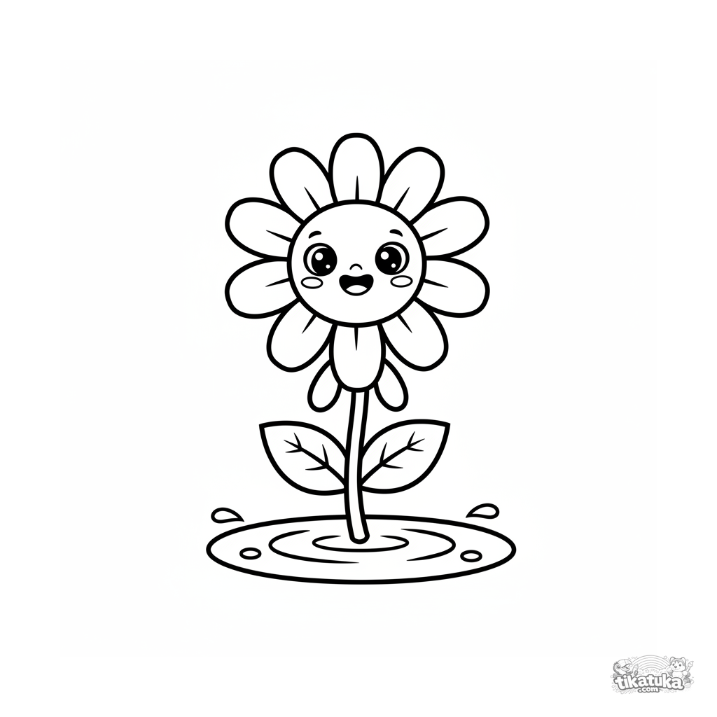 Página para colorir para bebês: uma margarida kawaii sorridente em uma poça de chuva. Formas grandes e simples com margens amplas.