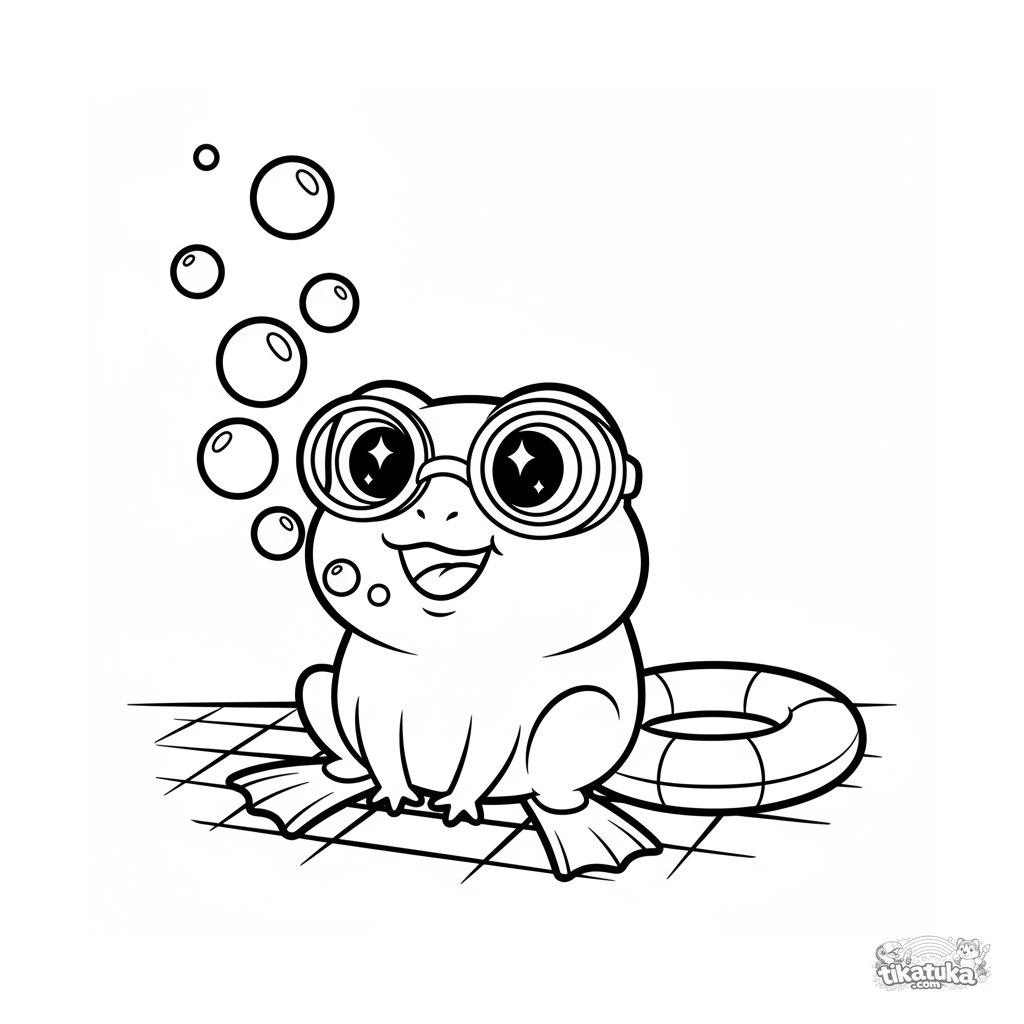 Página para colorir para bebês de 2-3 anos: um sapo fofo com óculos de natação sentado no fundo de uma piscina ao lado de uma bóia. Formas grandes e simples.