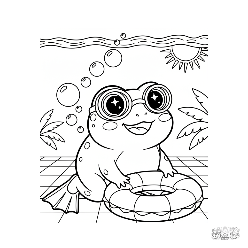 Página para colorir de um sapo kawaii com óculos de natação explorando o fundo da piscina. Para crianças de 7 a 9 anos.