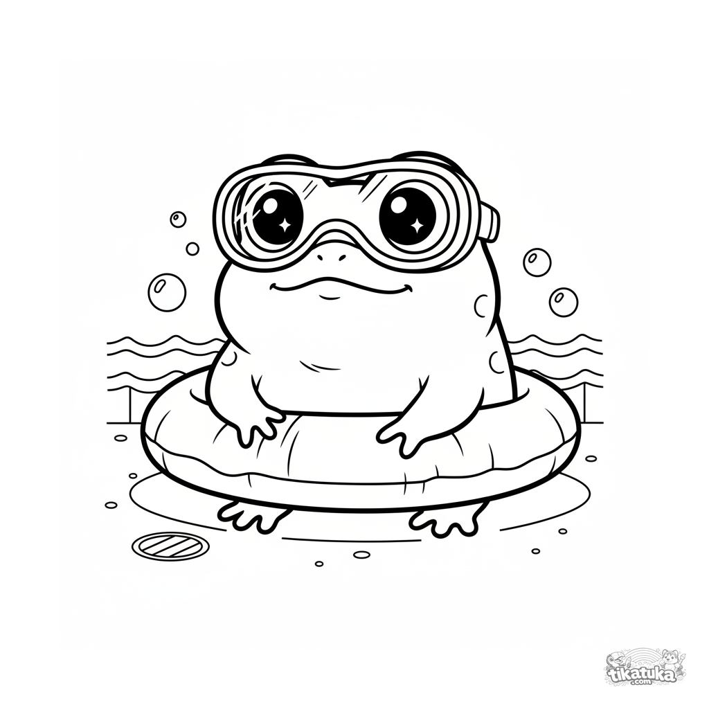 Página para colorir para 7-9 anos: um sapo kawaii fofo com óculos de mergulho espreita por trás de uma boia no fundo da piscina. Detalhes expressivos, contornos limpos.