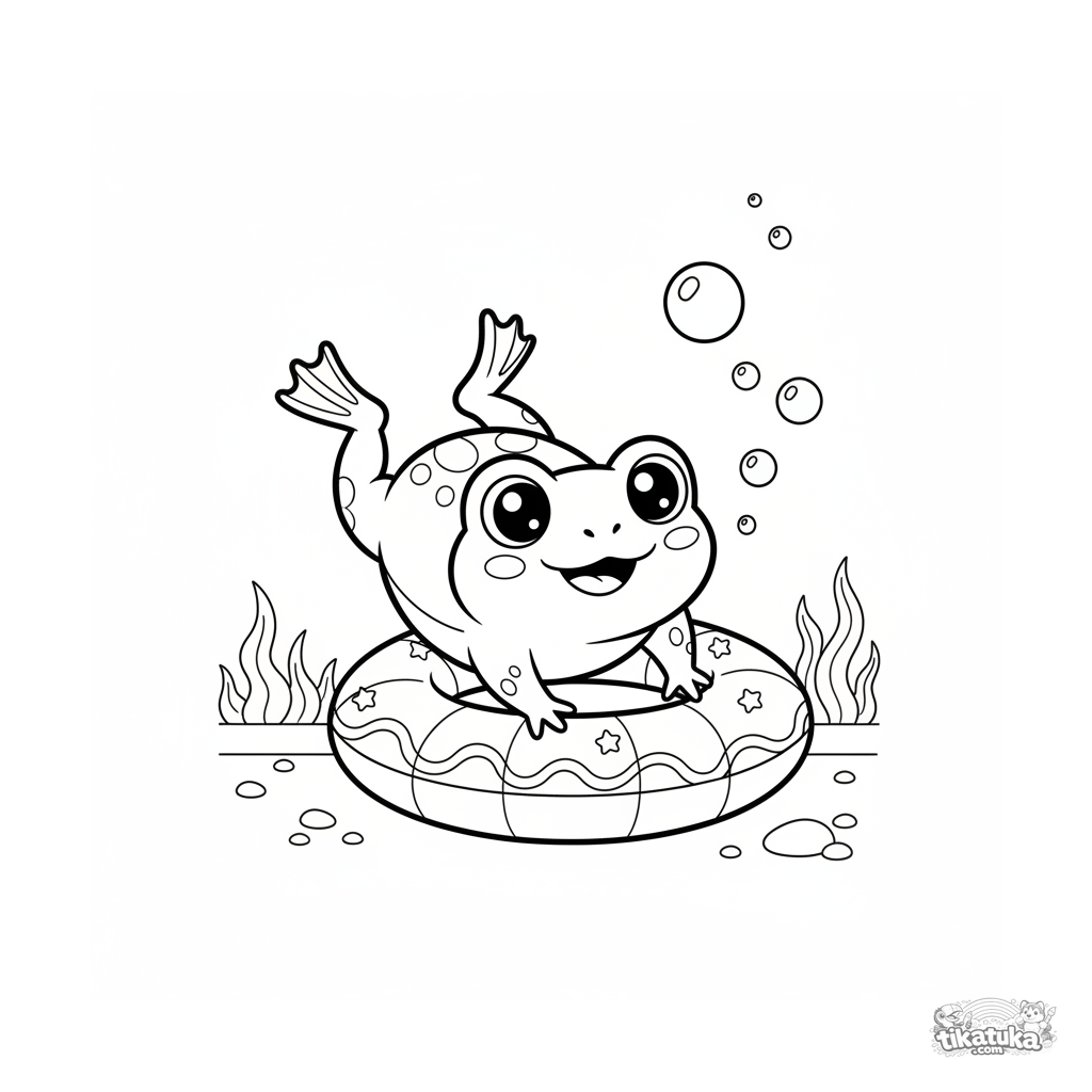 Página para colorir para crianças de 7-9 anos: um sapo estilo chibi mergulhando para o fundo da piscina em direção a uma boia. Pose dinâmica.