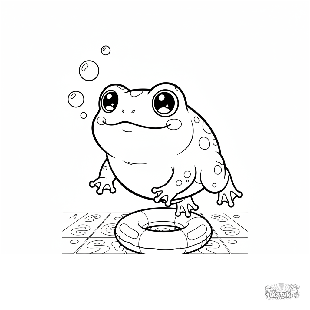 Página para colorir para crianças 4-6: um sapo fofo estilo anime mergulhando ao lado de um anel inflável no fundo da piscina. Formas claras, bolhas alegres.