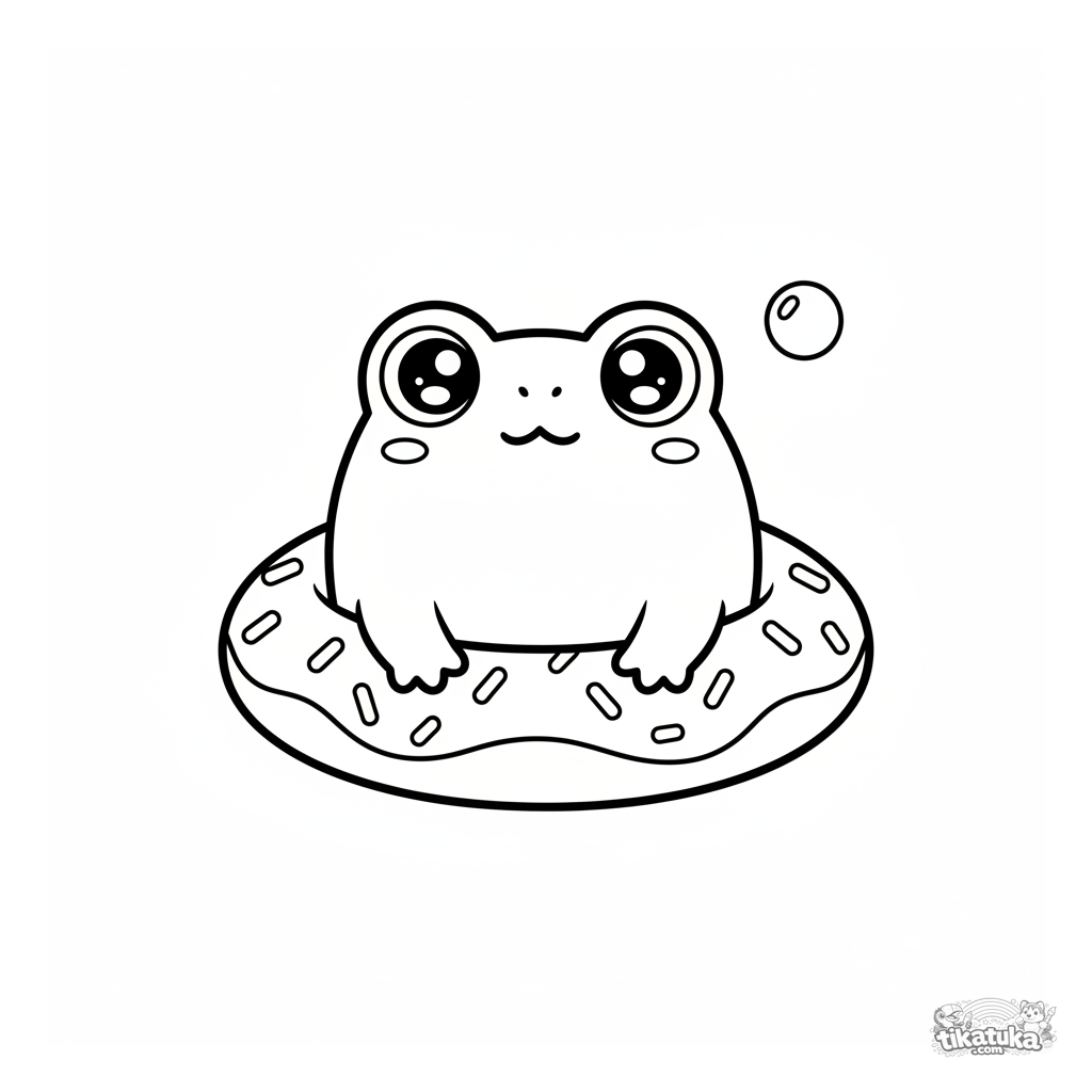 Página simples para colorir para bebês 2-3: um sapo kawaii redondo com olhos grandes espreita de um anel inflável no fundo da piscina.