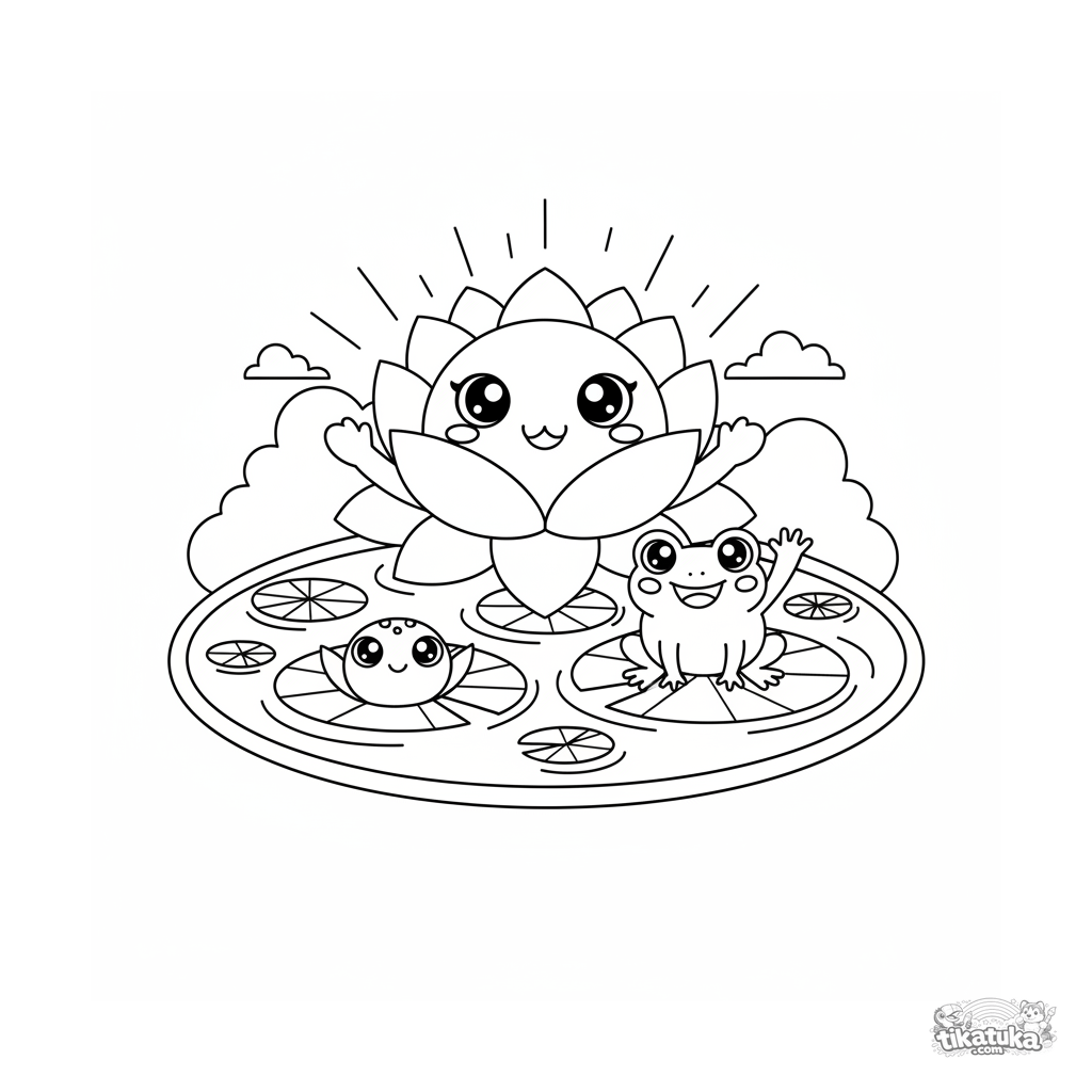 Página para colorir fofa para crianças de 4-6 anos: uma flor de lótus sorridente em uma lagoa com um sapo. Formas simples e cena amigável.