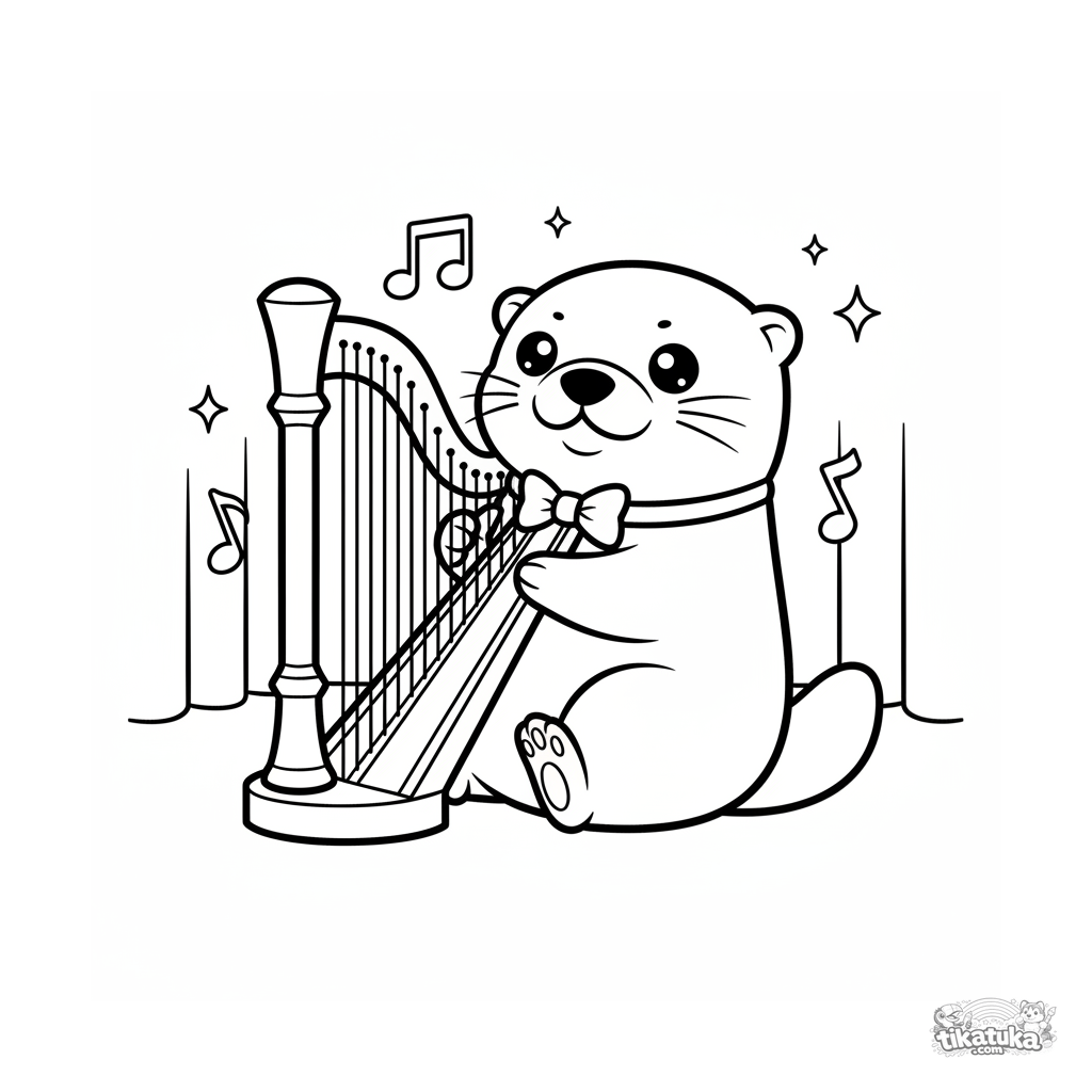 Página para colorir para crianças 7-9: uma adorável lontra kawaii tocando harpa em um palco de sala de concertos.