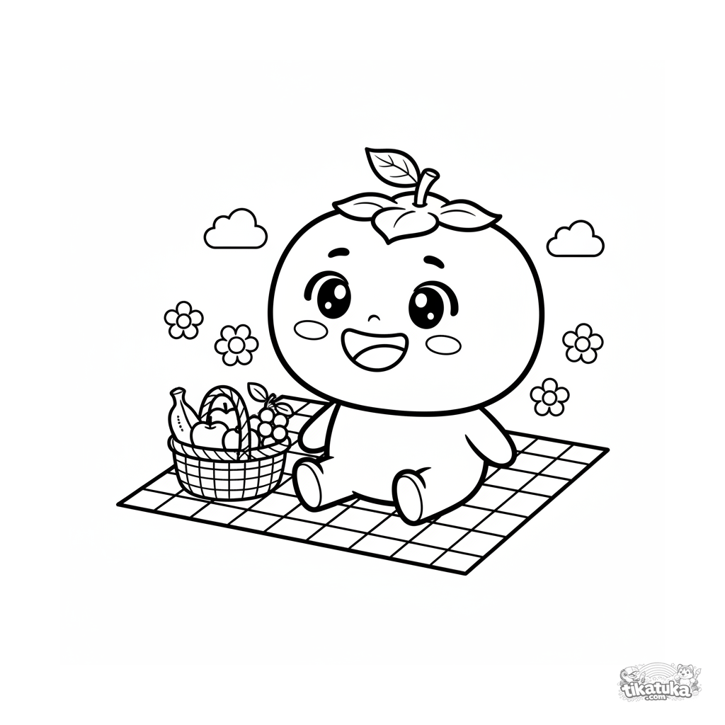 Página para colorir de um caqui kawaii em um piquenique. Para crianças de 4 a 6 anos. Personagem frutal alegre sentado em um cobertor xadrez com uma cesta.