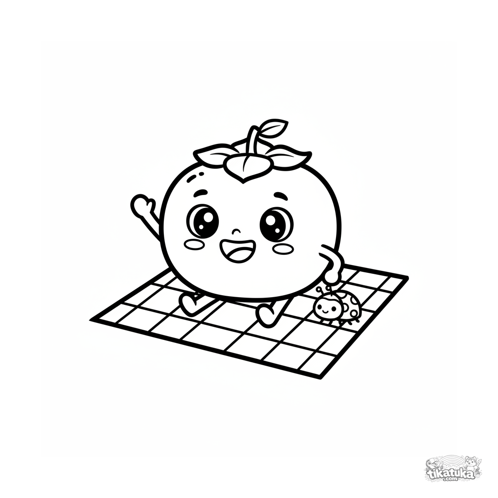 Página para colorir para crianças pequenas: um caqui kawaii com um sorriso acena de um piquenique. Formas simples, margens amplas.