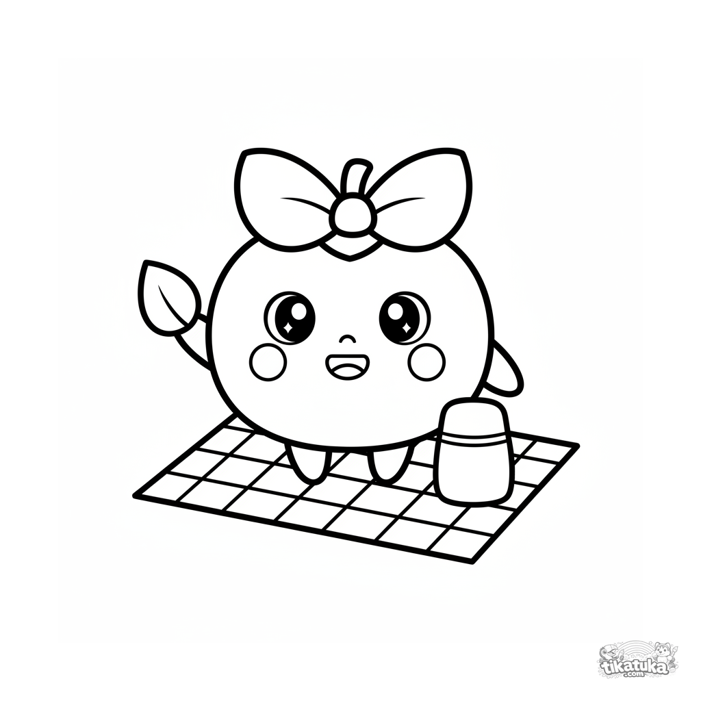 Página para colorir para crianças pequenas: um caqui kawaii com laço está em um piquenique xadrez. Formas simples, margens amplas para idades 2-3.
