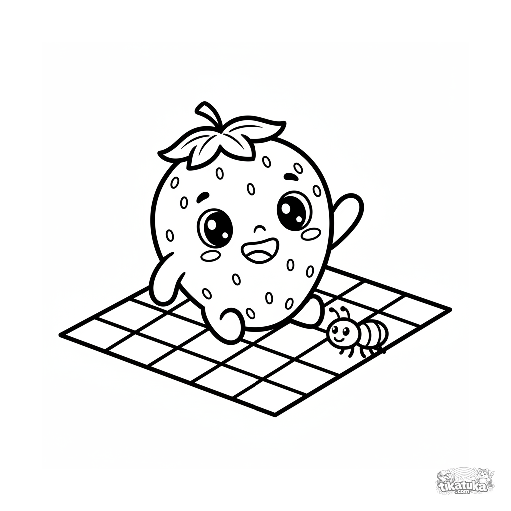 Página para colorir para crianças pequenas: um morango kawaii alegre acenando em um piquenique xadrez. Formas simples com margens amplas.