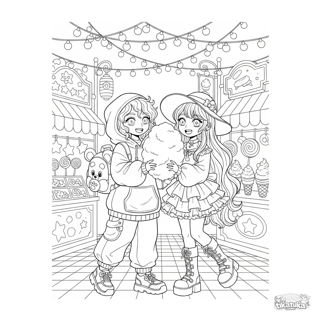 Página para colorir para crianças de 7-12 anos: uma dupla animada de moda de rua kawaii compartilhando algodão-doce em uma feira noturna.