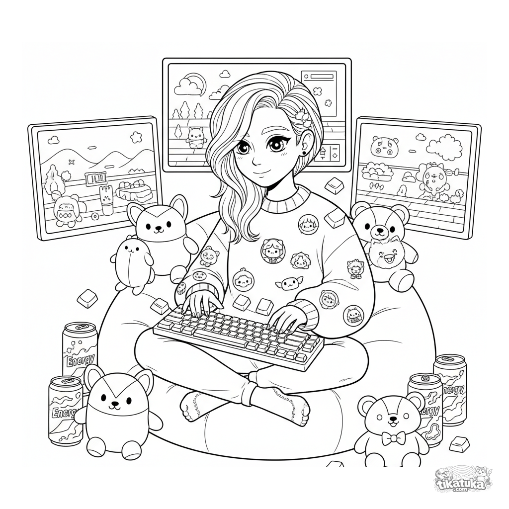Página para colorir para crianças 10-12: um hacker de estilo kawaii no porão personalizando um teclado mecânico. Cena detalhada com pelúcias e monitores.