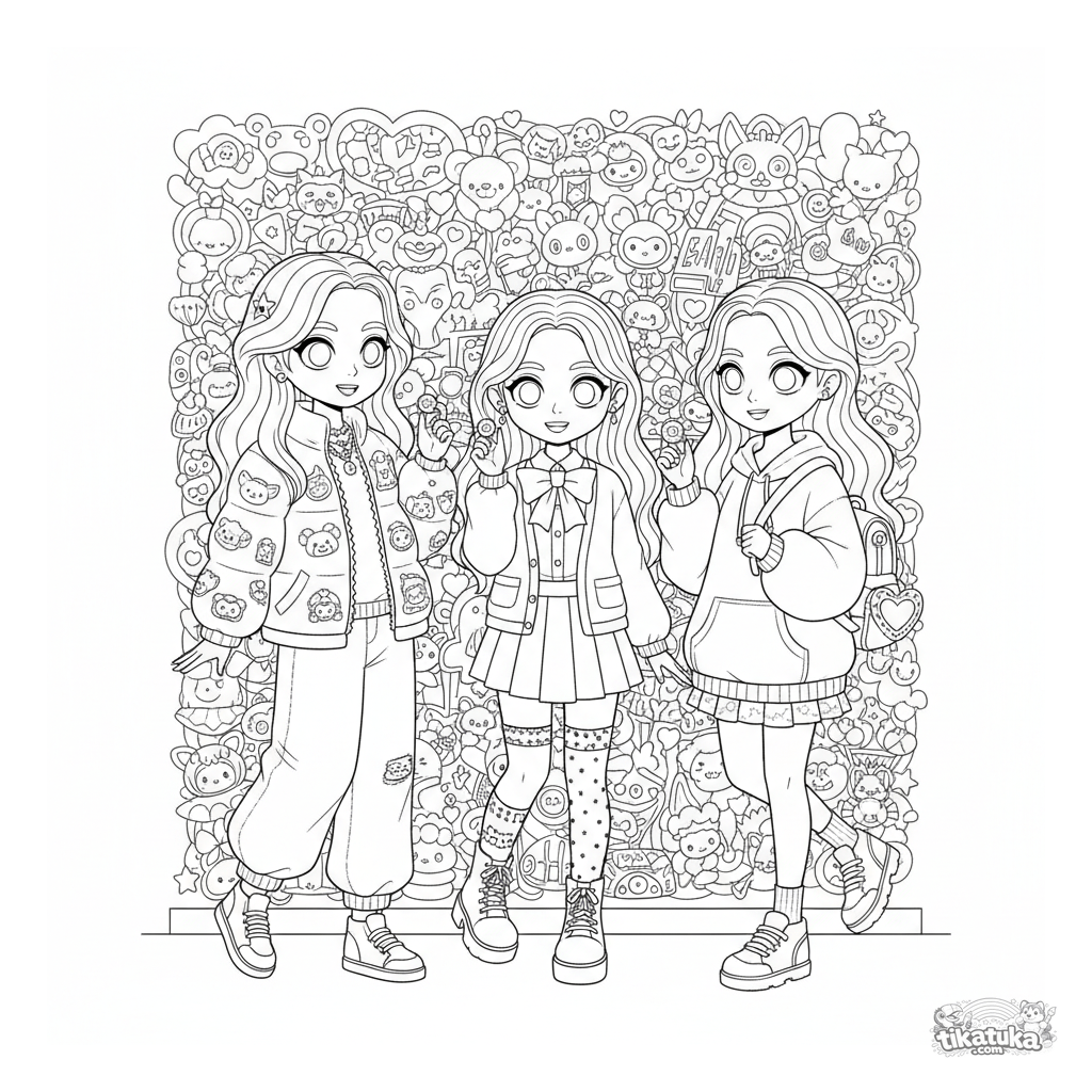 Página para colorir para crianças de 7 a 12 anos: um trio de moda de rua kawaii trocando pins na frente de um muro de grafite vibrante. Cena detalhada com muitos elementos.