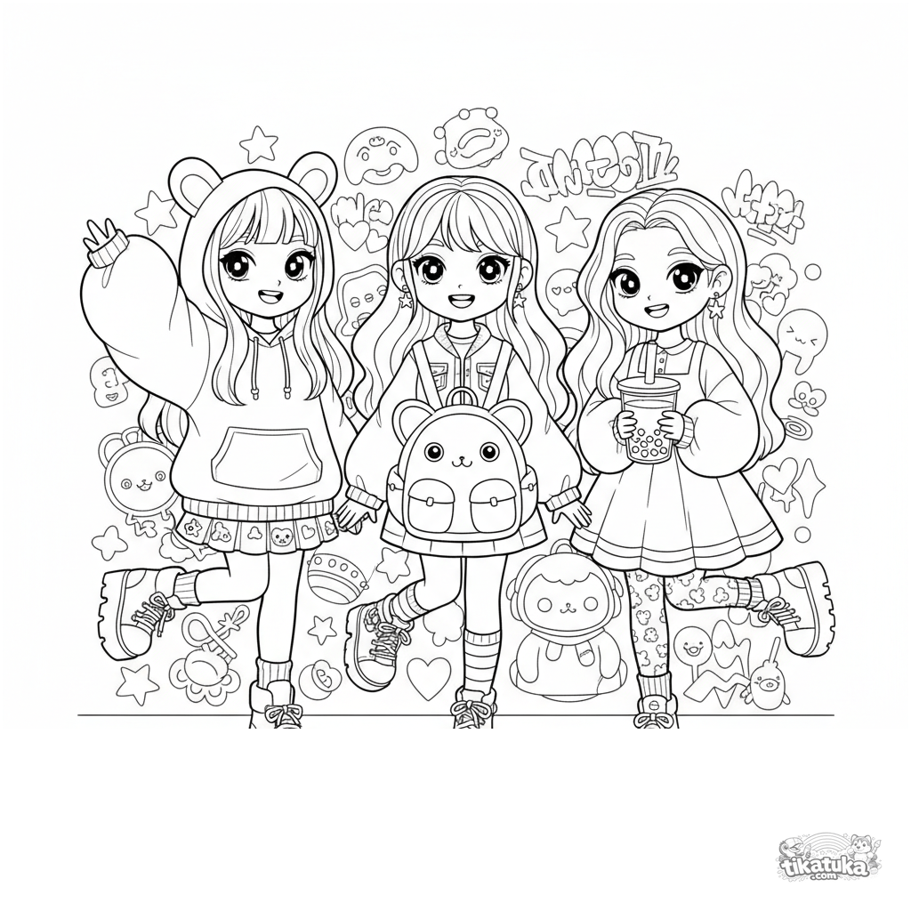 Página para colorir para crianças de 7 a 12 anos: um trio de moda de rua kawaii posando em frente a um muro de graffiti vibrante. Cena complexa com roupas e acessórios detalhados.