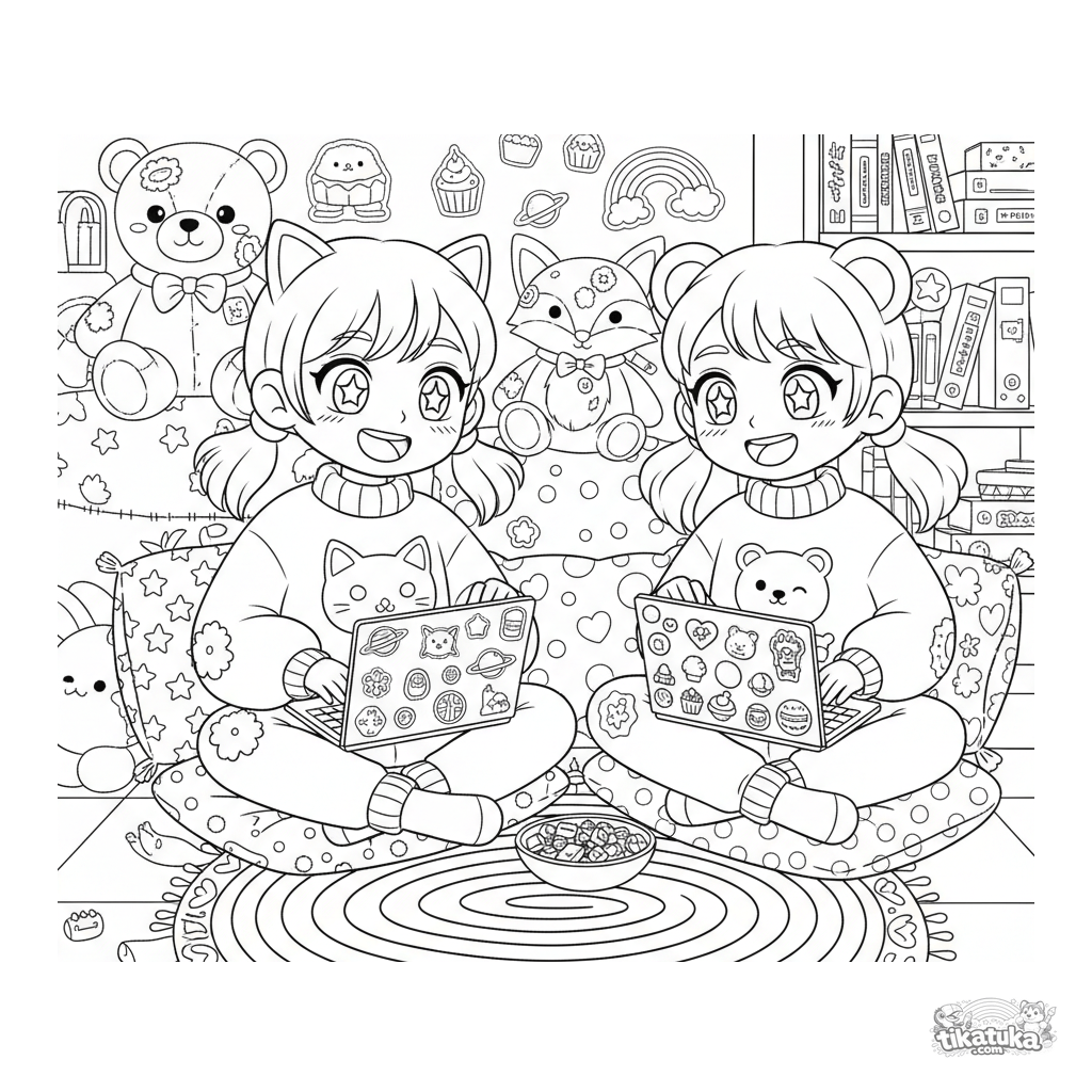 Página para colorir para crianças de 10-12 anos: dois amigos em um cantinho aconchegante do porão decorando seus laptops com adesivos e keycaps no estilo kawaii. Muitos detalhes e acessórios fofos.