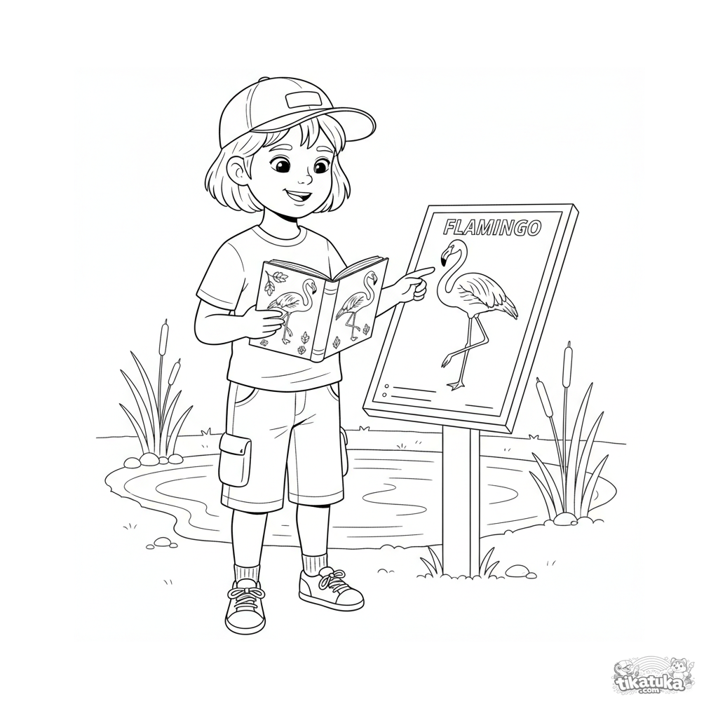 Página detalhada para colorir para 10-12 anos: uma criança compara um flamingo em um guia de campo com uma placa informativa no zoológico.