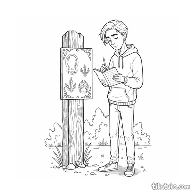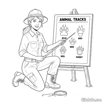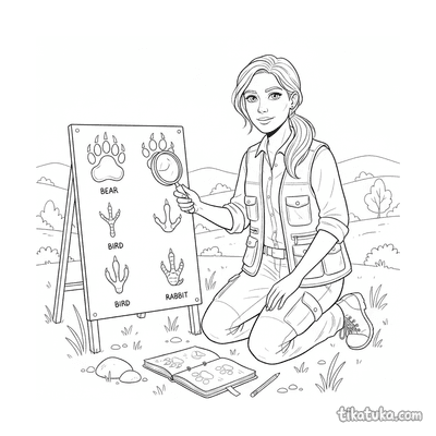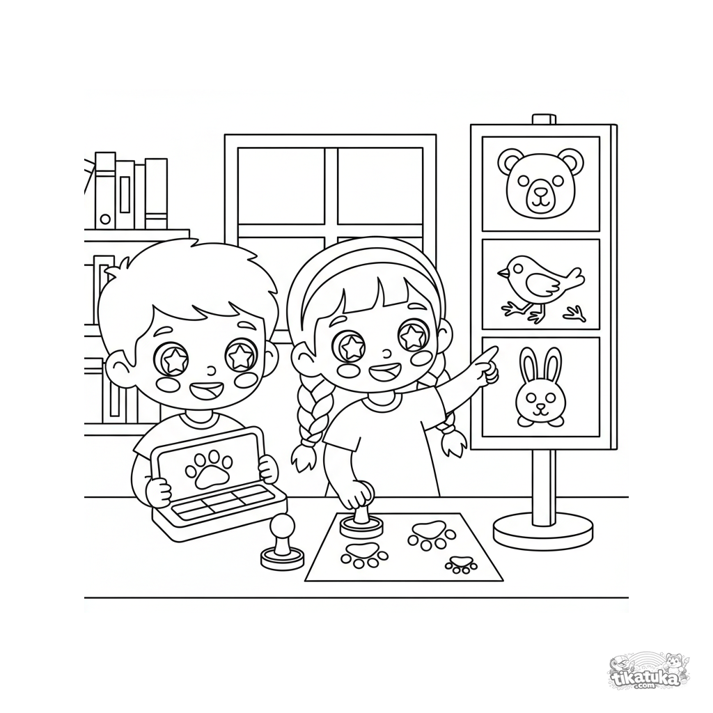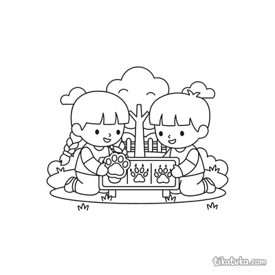 Página para colorir para crianças de 7-9 anos: crianças usam carimbos de pegadas e comparam com um cartaz de identificação. Estilo de recorte de papel.