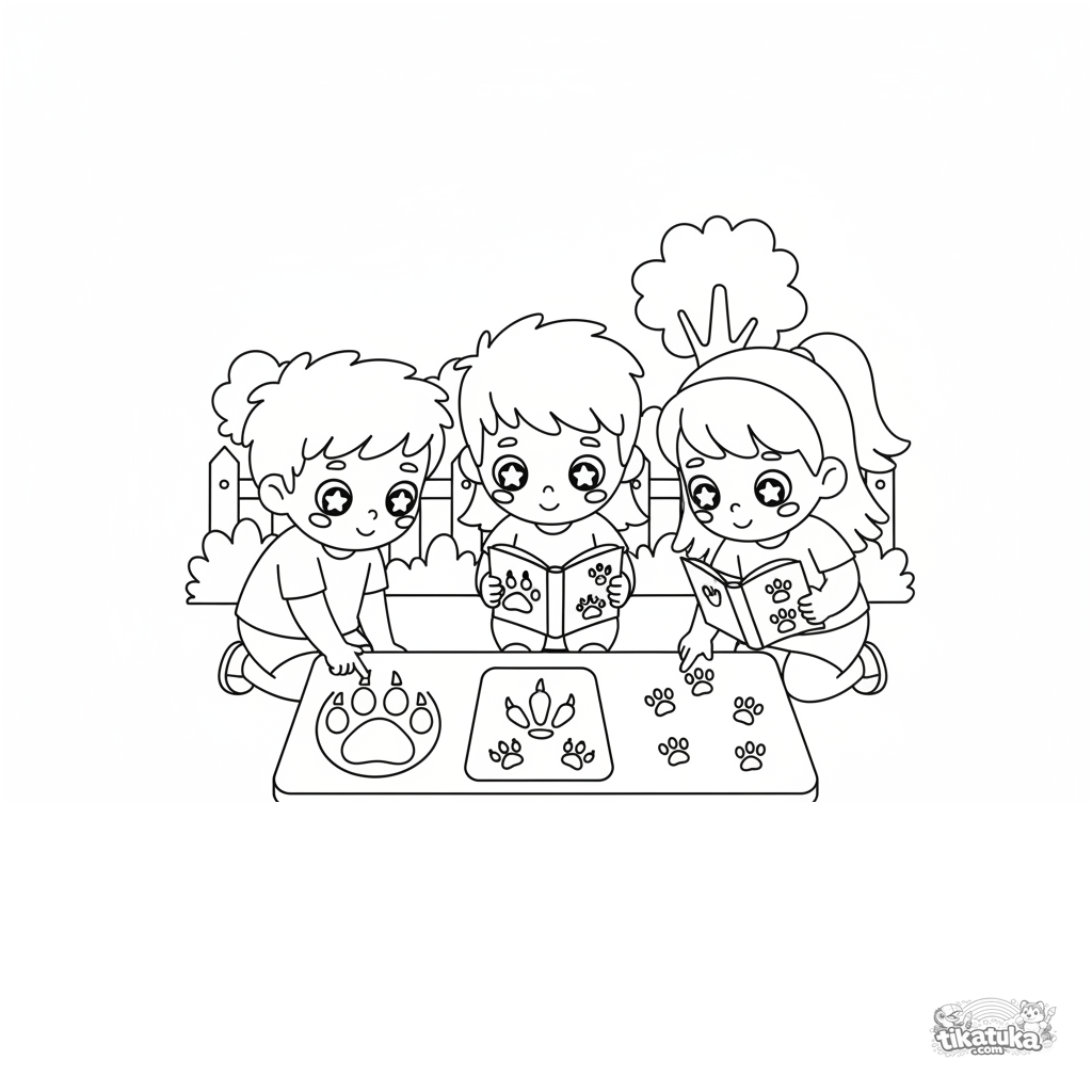 Página para colorir para crianças 4-6: crianças estudando e comparando diferentes pegadas de animais em uma placa especial no zoológico. Estilo vetorial plano e brilhante.