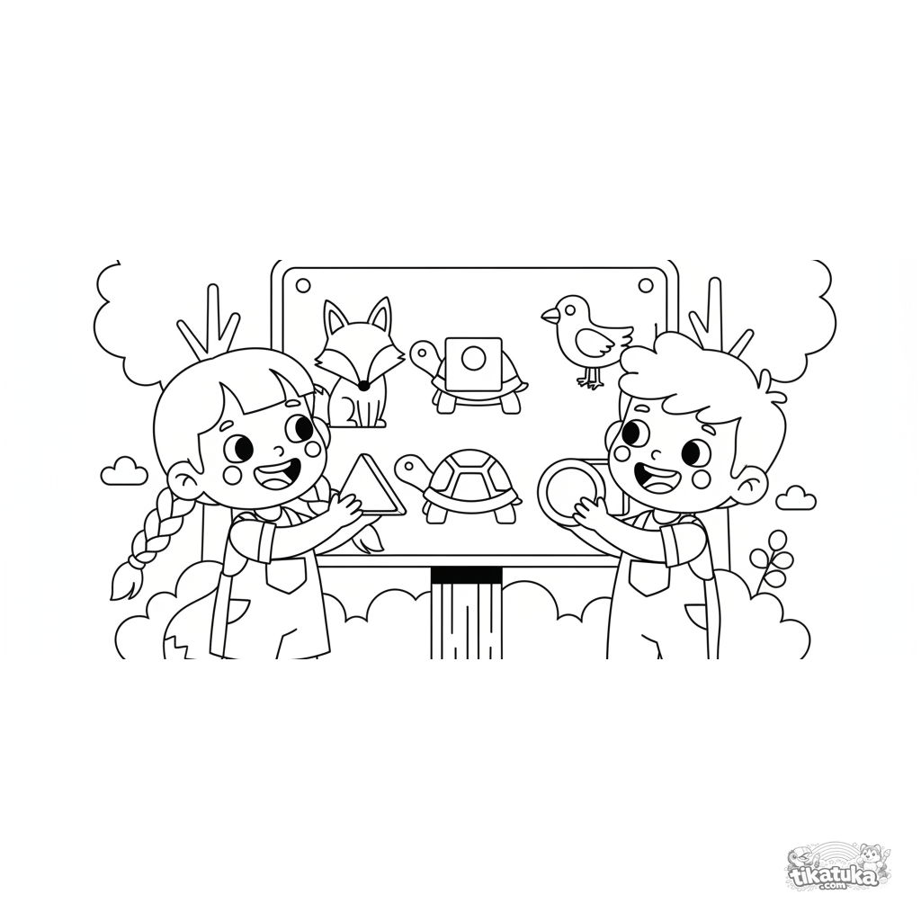 Página para colorir para crianças 7-9: crianças em um painel interativo do zoológico combinam formas geométricas com silhuetas de animais. Aprendendo formas brincando.