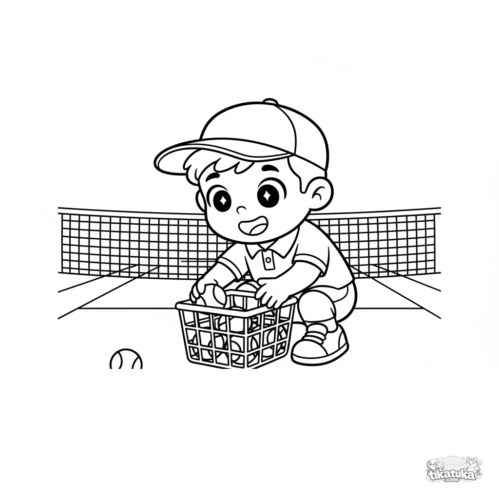 Página para colorir para crianças de 4-6 anos: um jovem ajudante em uma quadra de tênis coletando bolas. Cena divertida e compreensível sobre um papel esportivo.