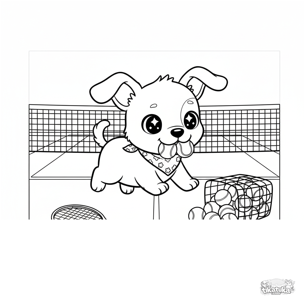 Página para colorir para crianças 4-6 anos: um filhote fofo corre pela quadra de tênis pegando bolas. Cena engraçada com cesta e raquete.