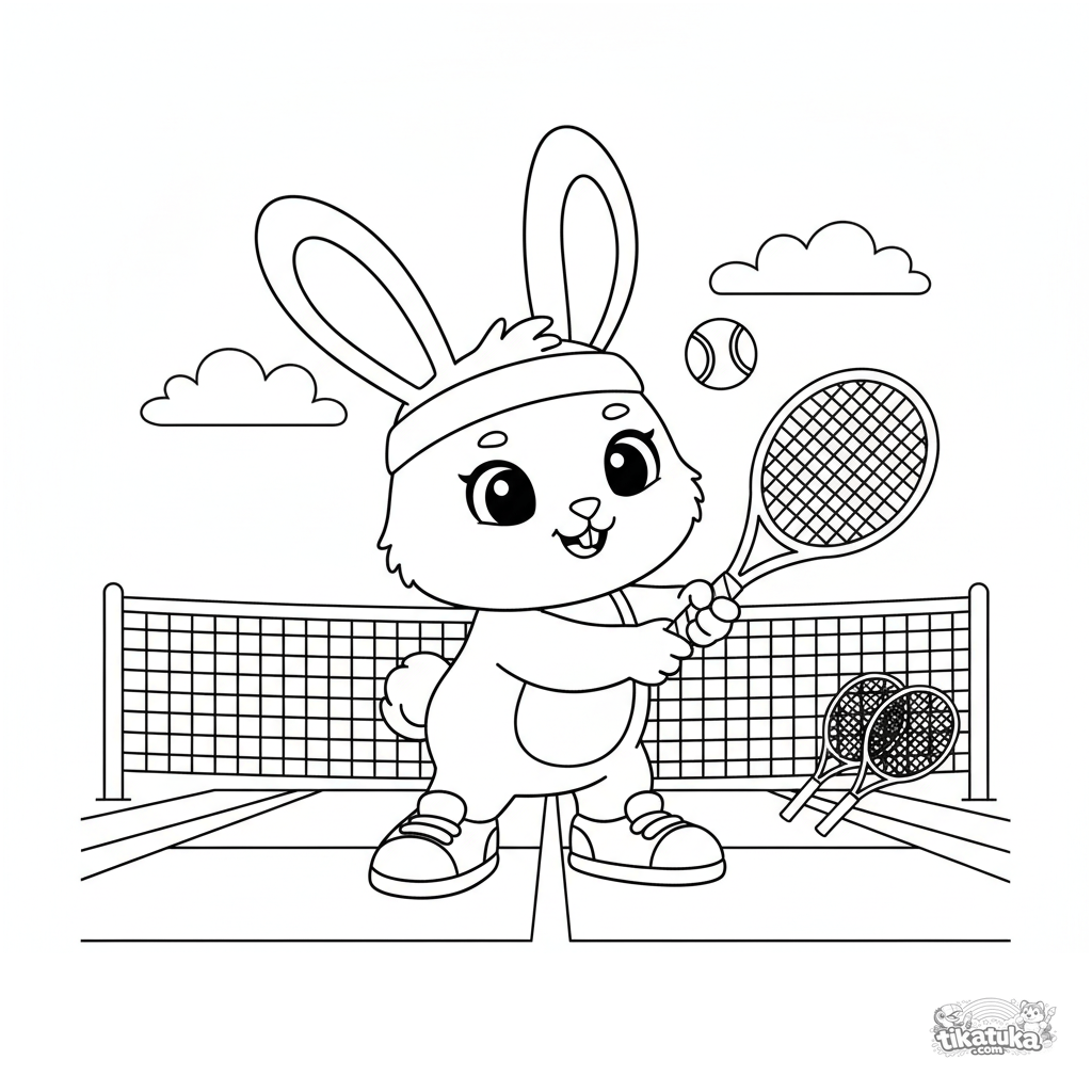 Página para colorir para crianças de 4-6 anos: um coelho fofo se prepara para sacar na quadra de tênis. Cena vibrante com rede e contornos claros.